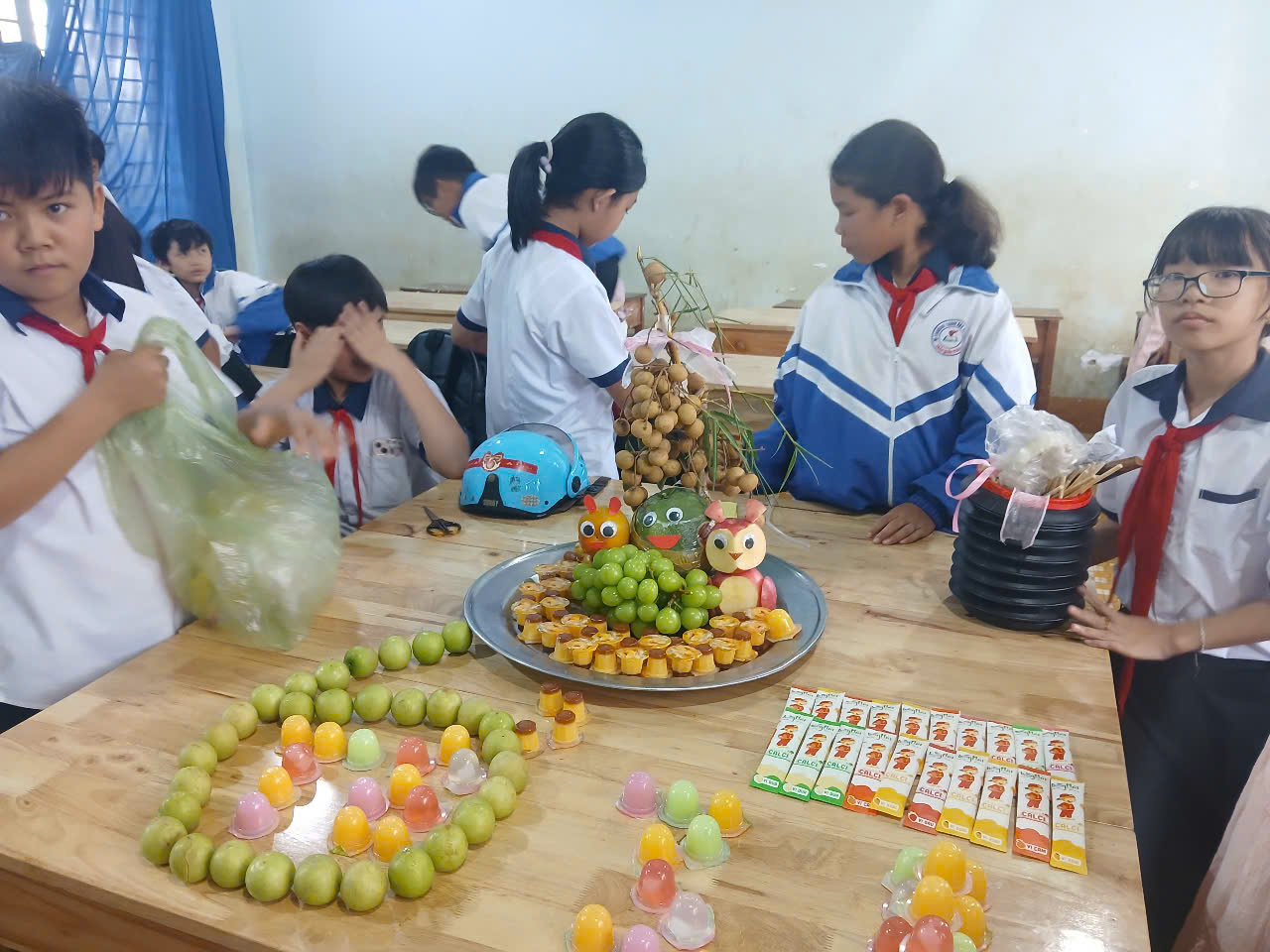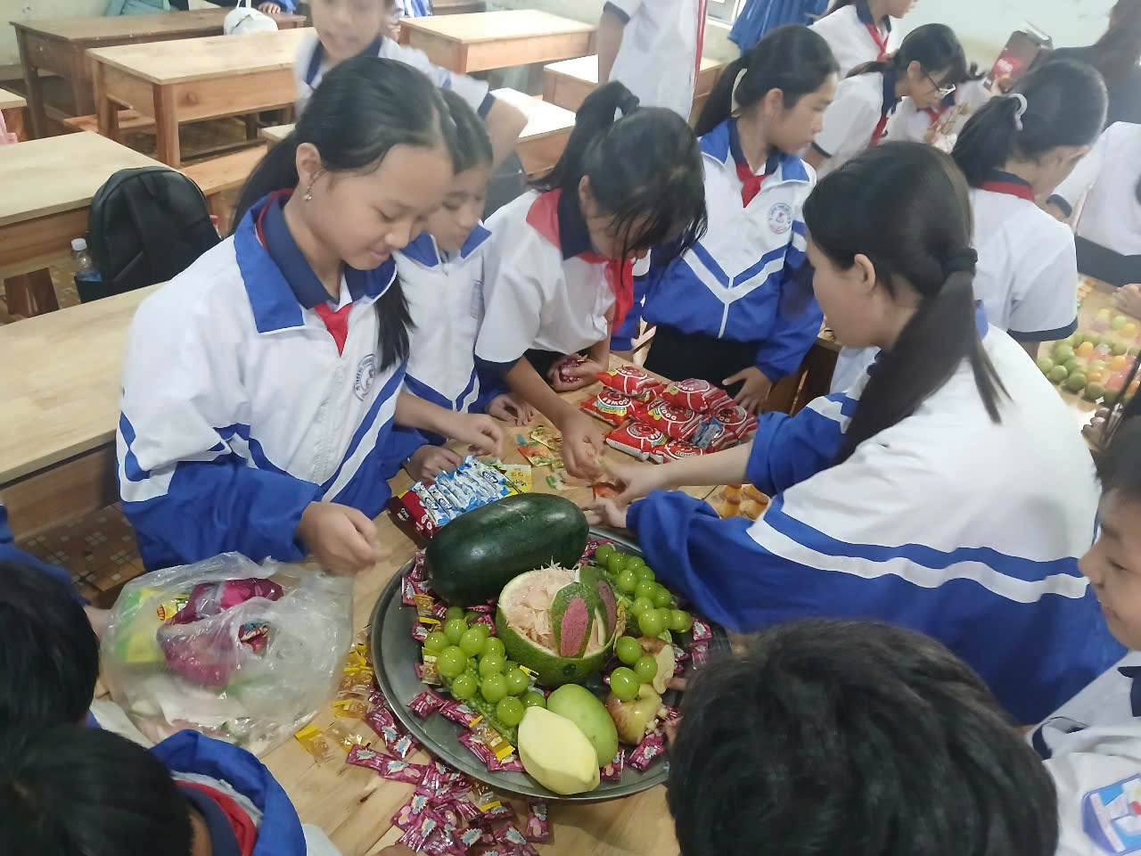 Từ việc cùng nhau sắp xếp từng gói kẹo, gọt hoa quả, đến khi cùng nhau quây quần phá cỗ, mỗi bức ảnh đều ghi lại một khoảnh khắc đáng nhớ. Đó là sự hợp tác, niềm vui và sự sẻ chia hồn nhiên của tuổi học trò.