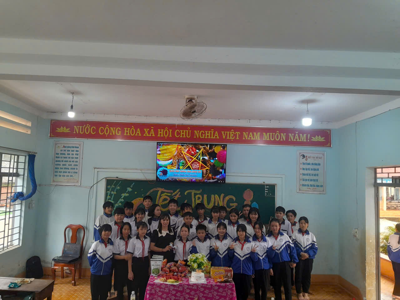 • Lồng Đèn Rực Rỡ: Dù là đèn ông sao truyền thống hay lồng đèn tự làm, vật phẩm này là linh hồn của đêm rằm. Lồng đèn được đặt trang trọng trên bàn tiệc, góp phần tô điểm cho không gian lớp học thêm lung linh (như lồng đèn được trang trí trên bàn ở ảnh chụp chung).