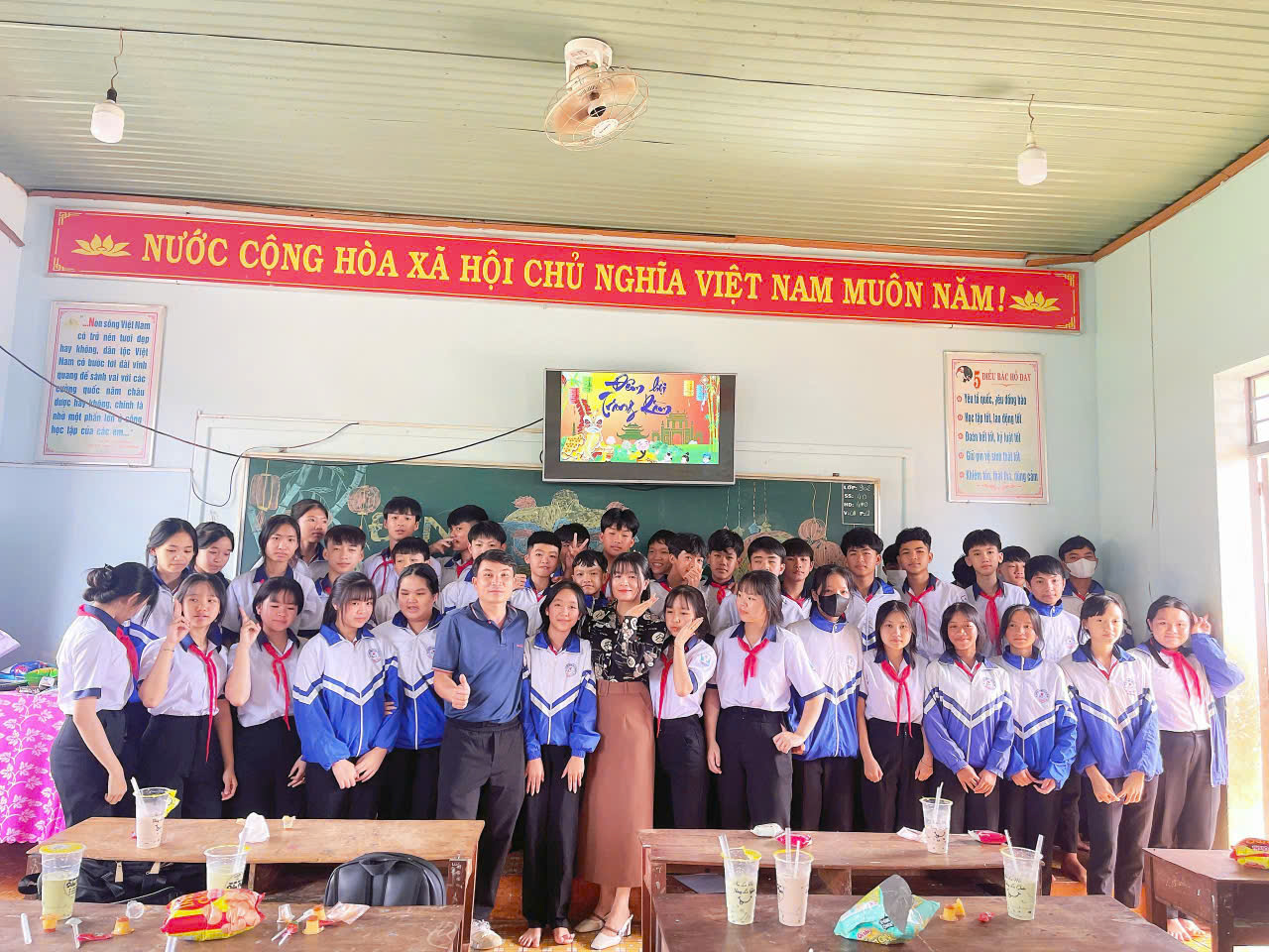 • Niềm Vui Tập Thể: Các em học sinh trong trang phục đồng phục đã cùng nhau tụ họp, chụp ảnh kỷ niệm bên mâm cỗ do chính tay mình chuẩn bị. Nụ cười rạng rỡ của các em và sự hiện diện của giáo viên chủ nhiệm (trong một số bức ảnh) cho thấy sự quan tâm và tham gia nhiệt tình của thầy cô vào hoạt động ngoại khóa này.